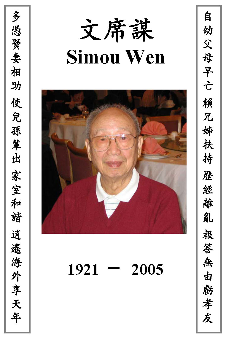 Simou Wen passed away in the early morning of January 17, 2005 in Alhambra, CA. He was survived by his beloved wife Min-Shan, sons Ting-Jien and Ting-Yung, daughters Ting-Ling, Ting-Shu, and Ting-Ho, and 13 grandchildren.