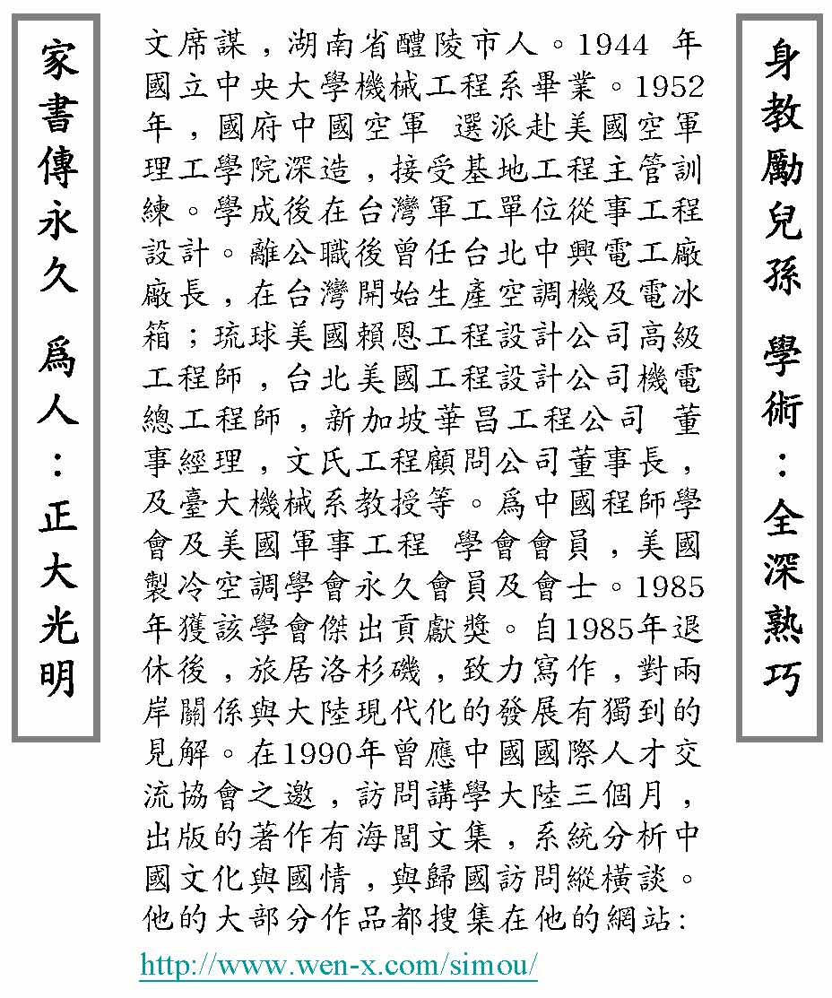对家庭、朋友、乡亲,文兄都安排得好好的。我想他唯有 一个心愿未了:就是台海