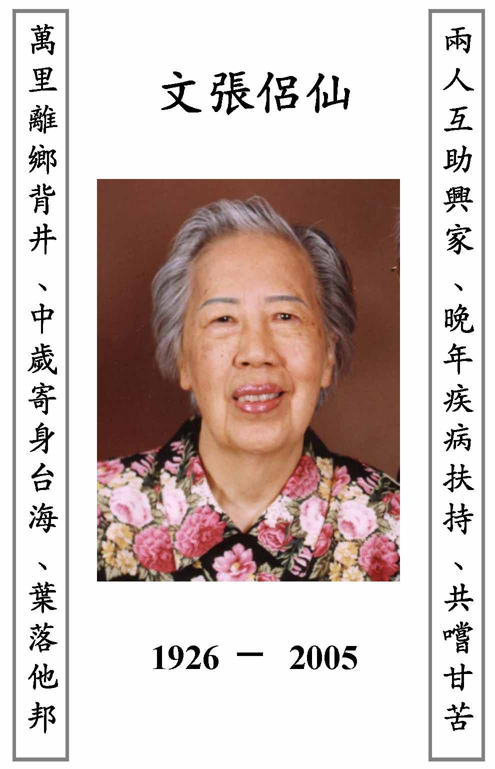 文張名仙 女士 ﹑字侶仙生於一九二六(丙寅) 六月初五 祖籍 湖南省醴陵縣。慟於 二零零五年三月十七日逝於Tacoma, WA。享年七十八歲。孝兒女等隨侍在側﹐親視 含殮﹐遵 禮成服。恭謹敬告諸親友