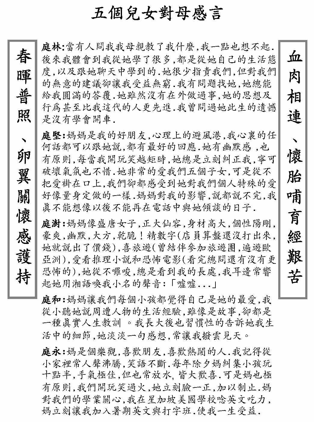 | Supported by wife, reared many offsprings, in harmony and unity; I am fortunate to enjoy old age overseas | Writings for future generations — self conduct: honesty, generosity, openness, clarity |